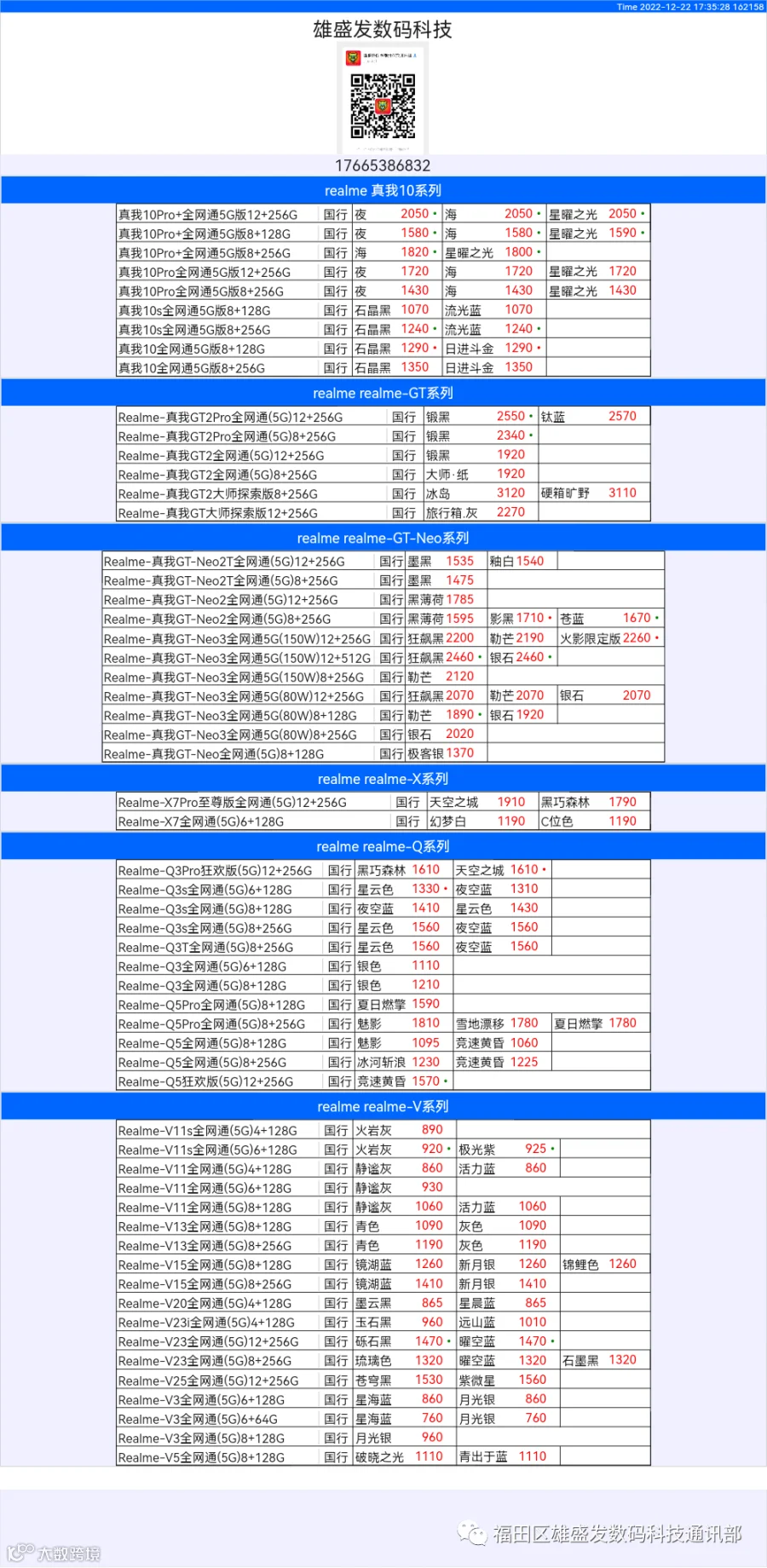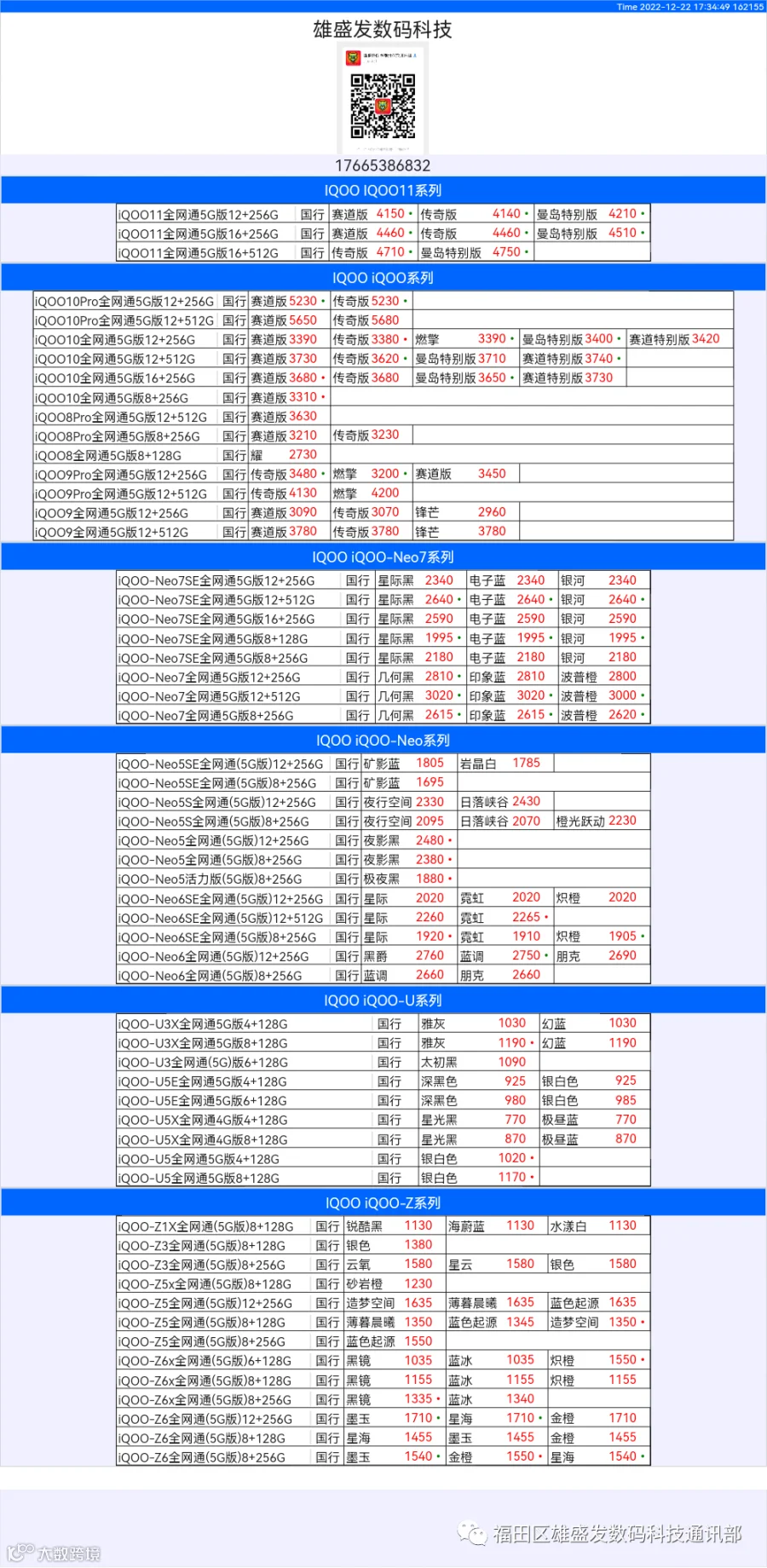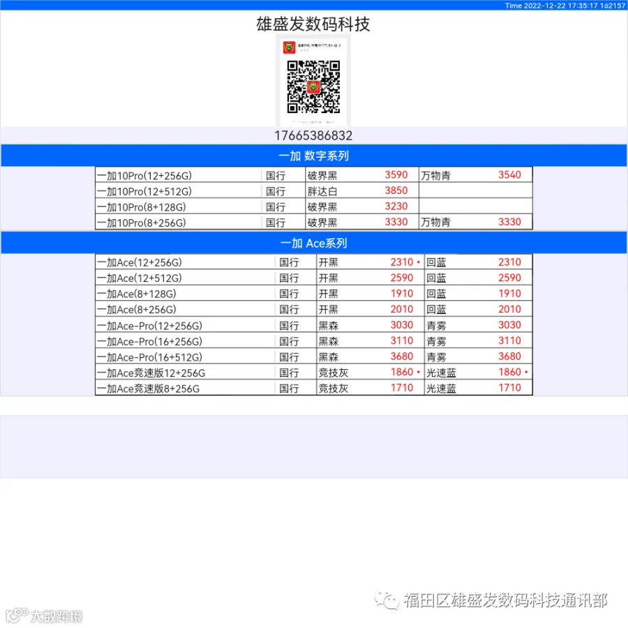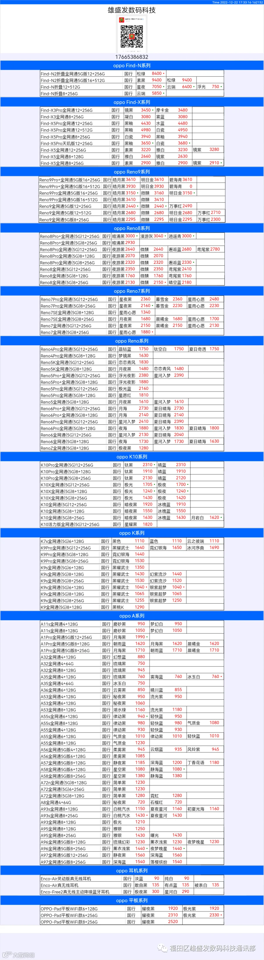 新机报价【2022年12月22日】OPPO   VIVO  IQOO   一加   真我 芯烨微 电子科技