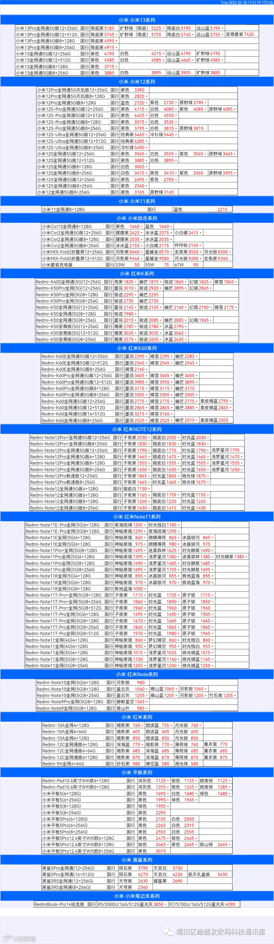 新机报价【2023年2月20日】小米  红米   黑鲨   报价 芯烨微 电子科技