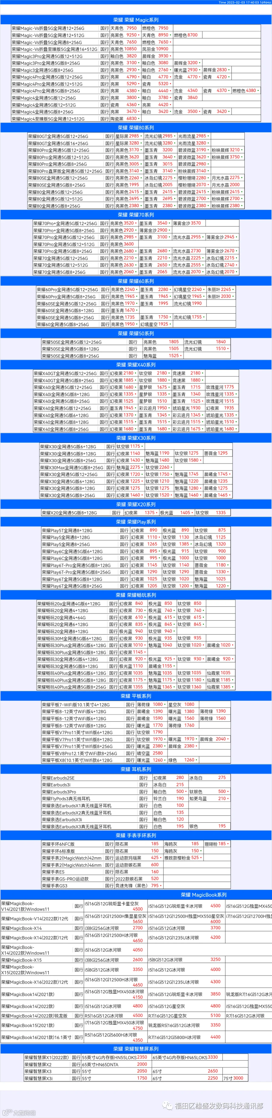 新机报价【2023年2月3日】华为   荣耀 报价 芯烨微 电子科技