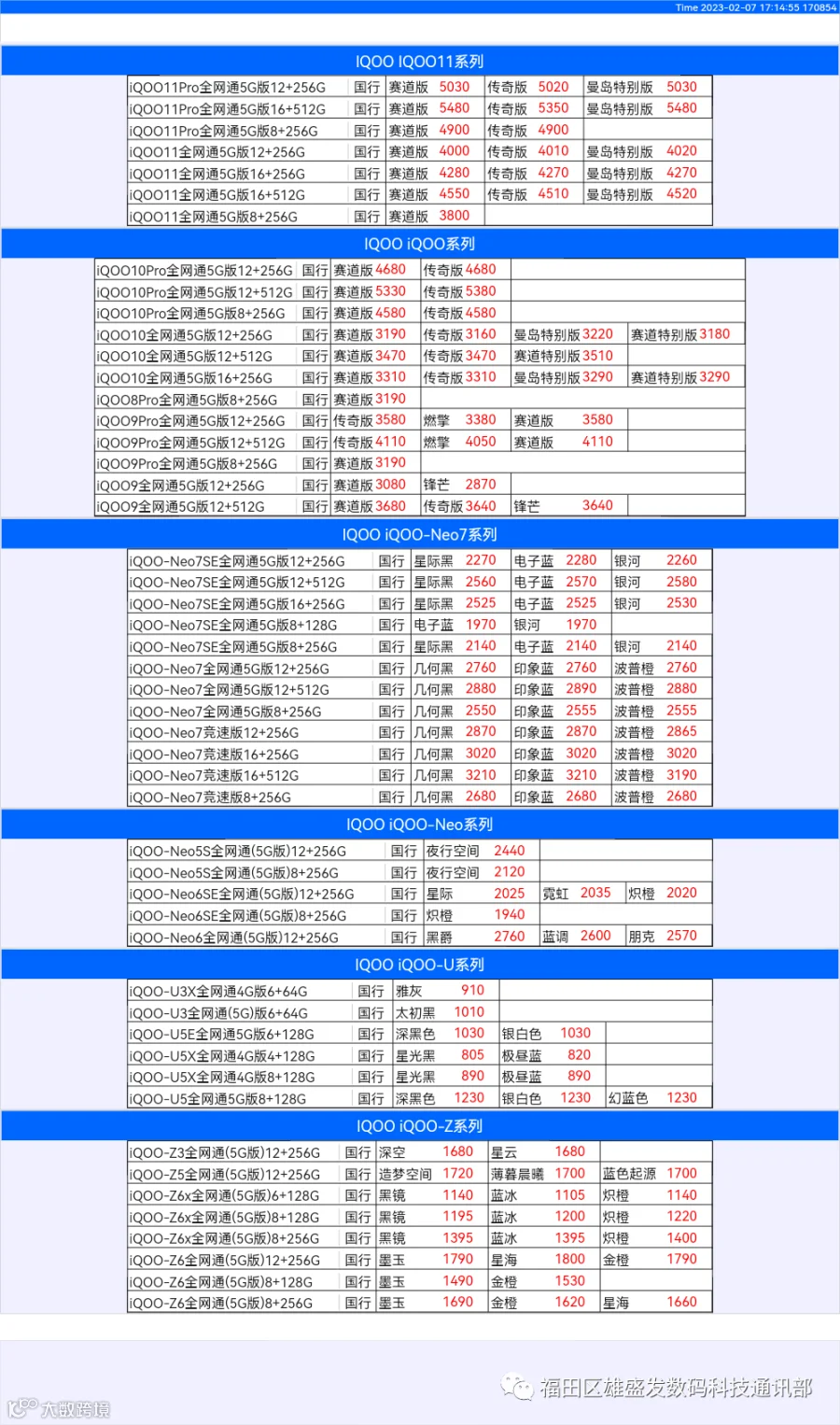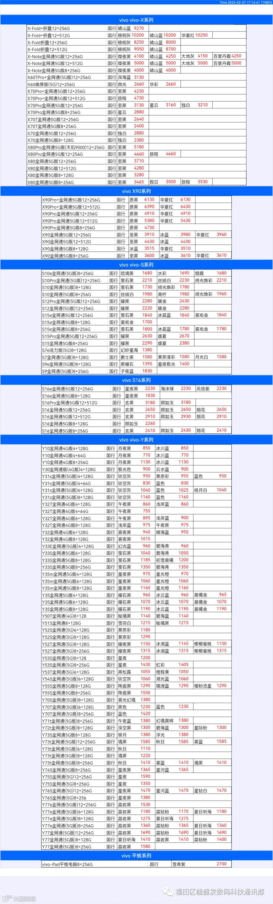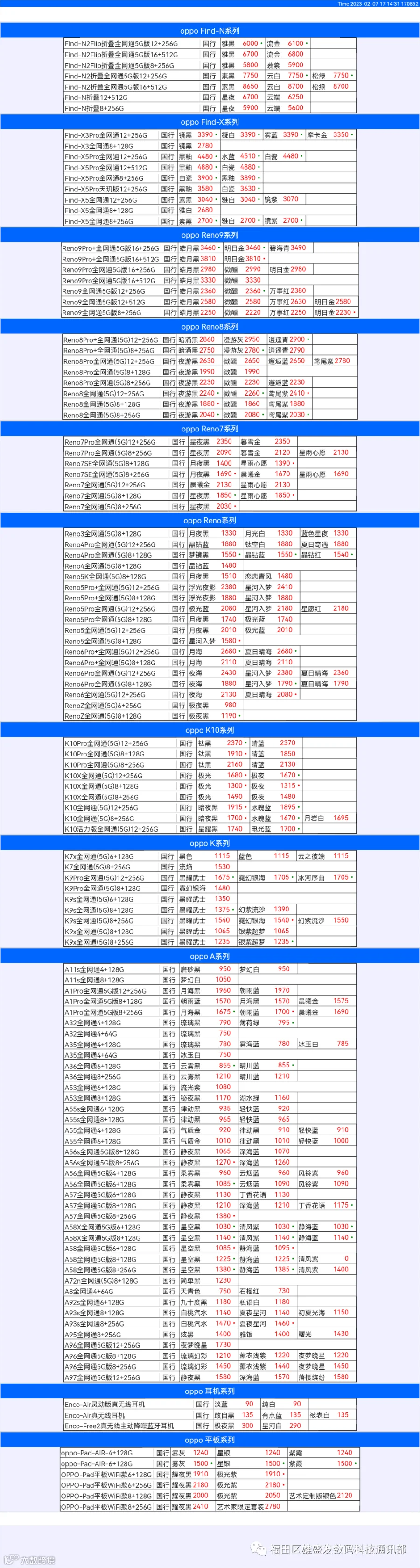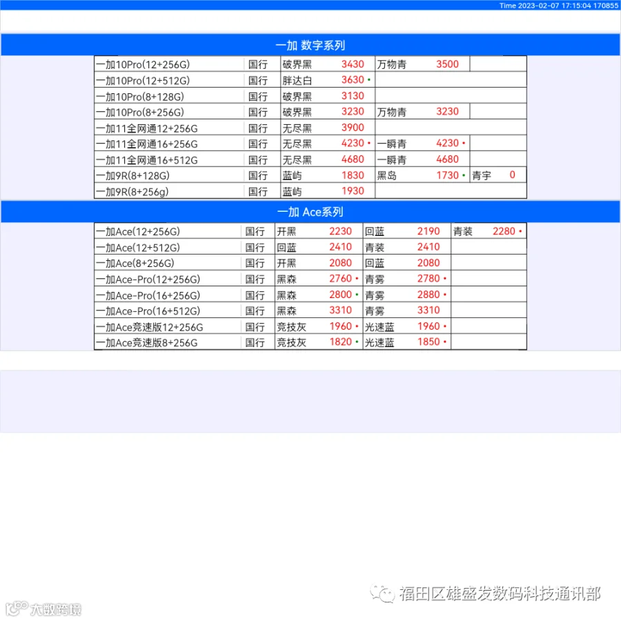 新机报价【2023年2月7日】OPPO   VIVO  IQOO   一加   真我 芯烨微 电子科技