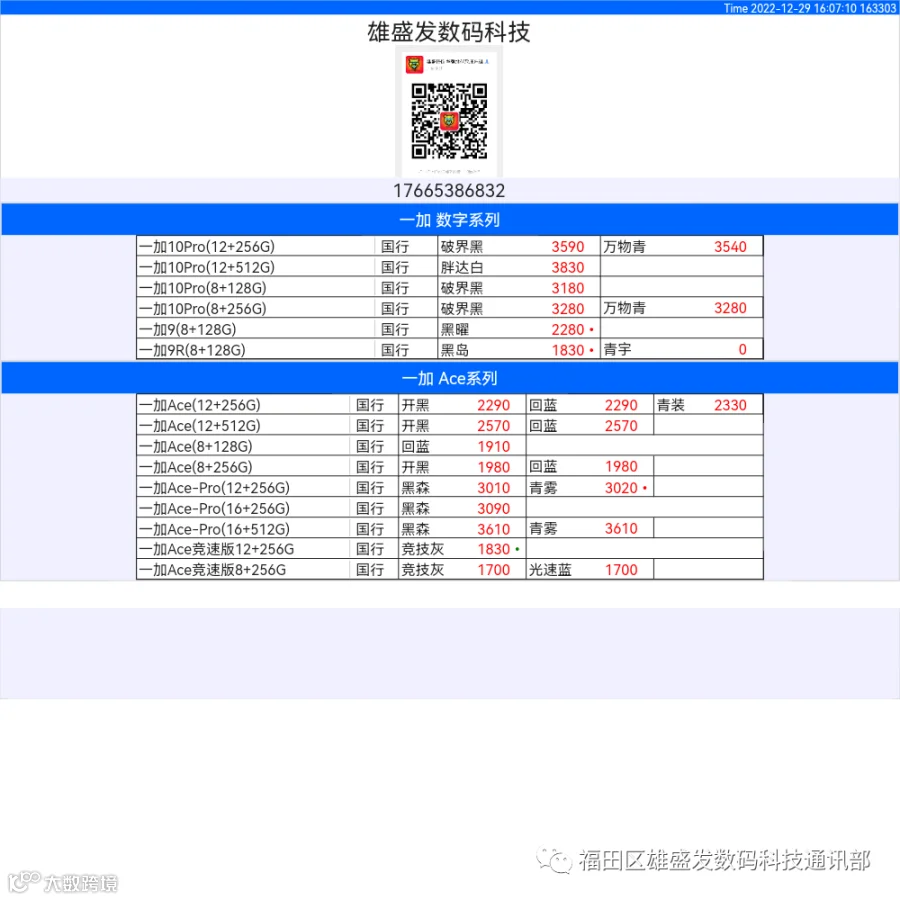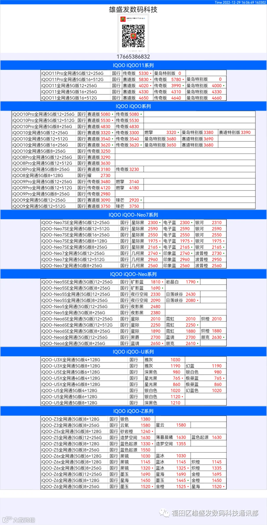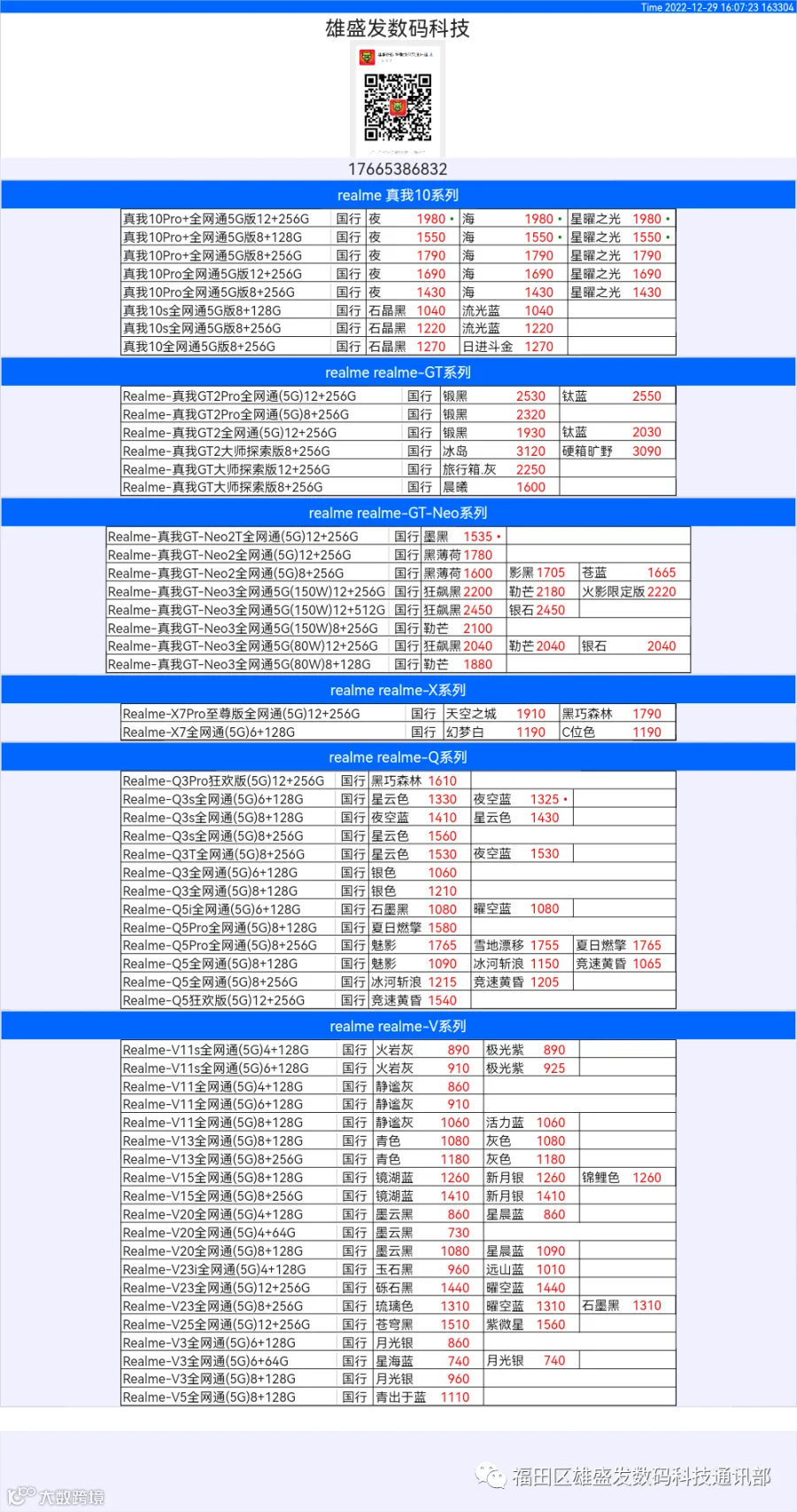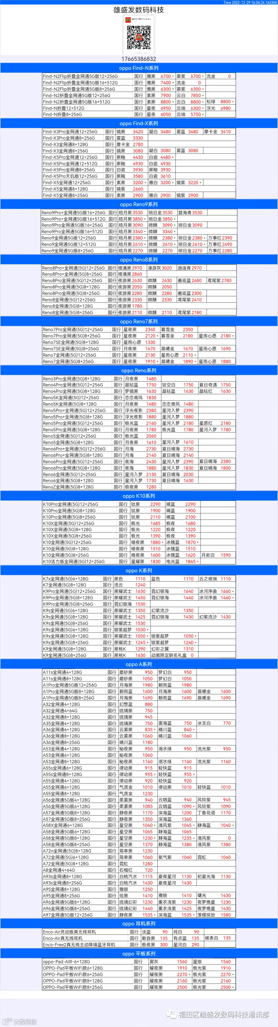 新机报价【2022年12月29日】OPPO   VIVO  IQOO   一加   真我 芯烨微 电子科技