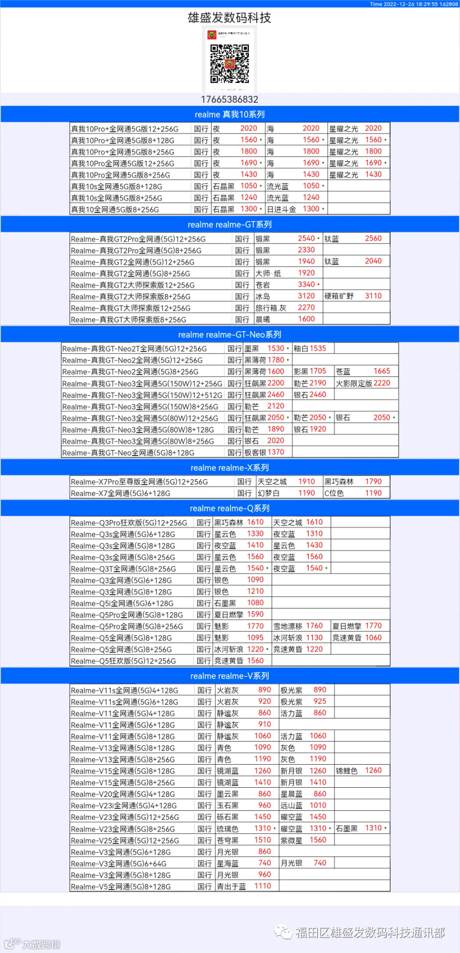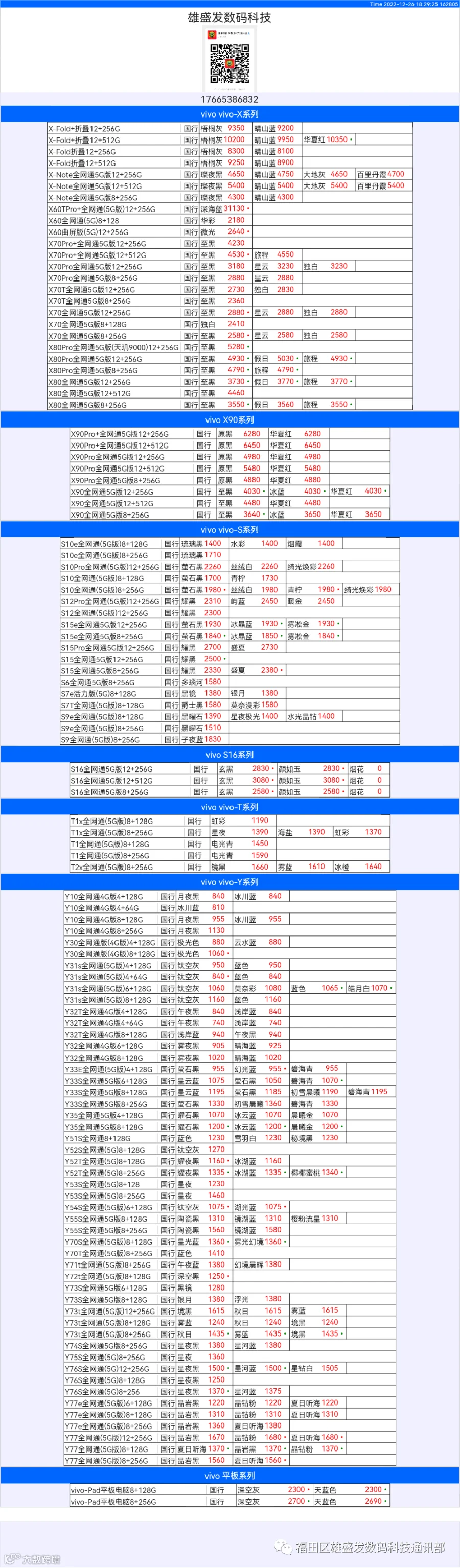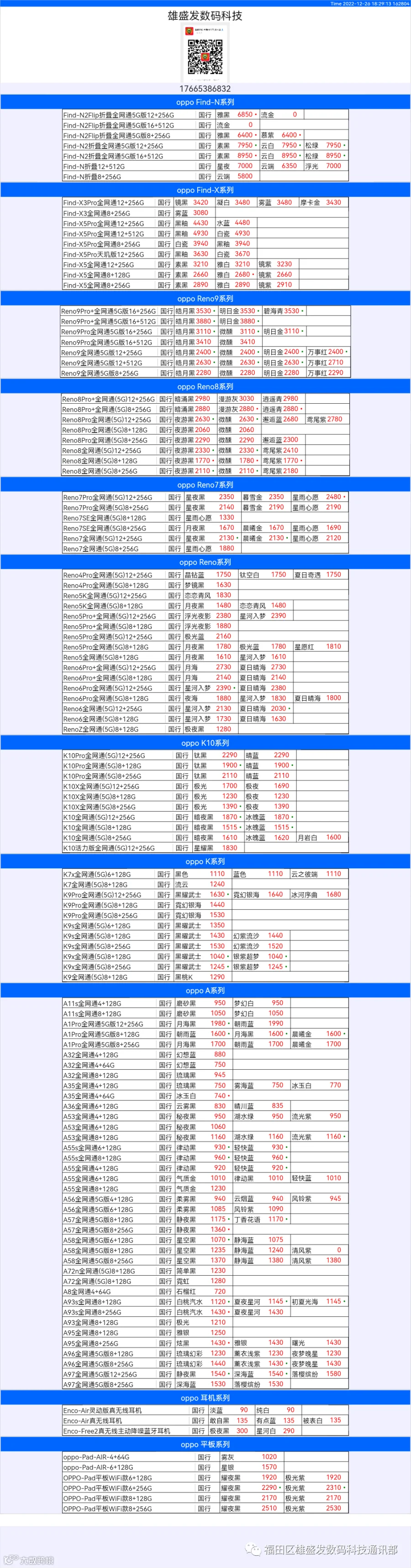 新机报价【2022年12月26日】OPPO   VIVO  IQOO   一加   真我 芯烨微 电子科技