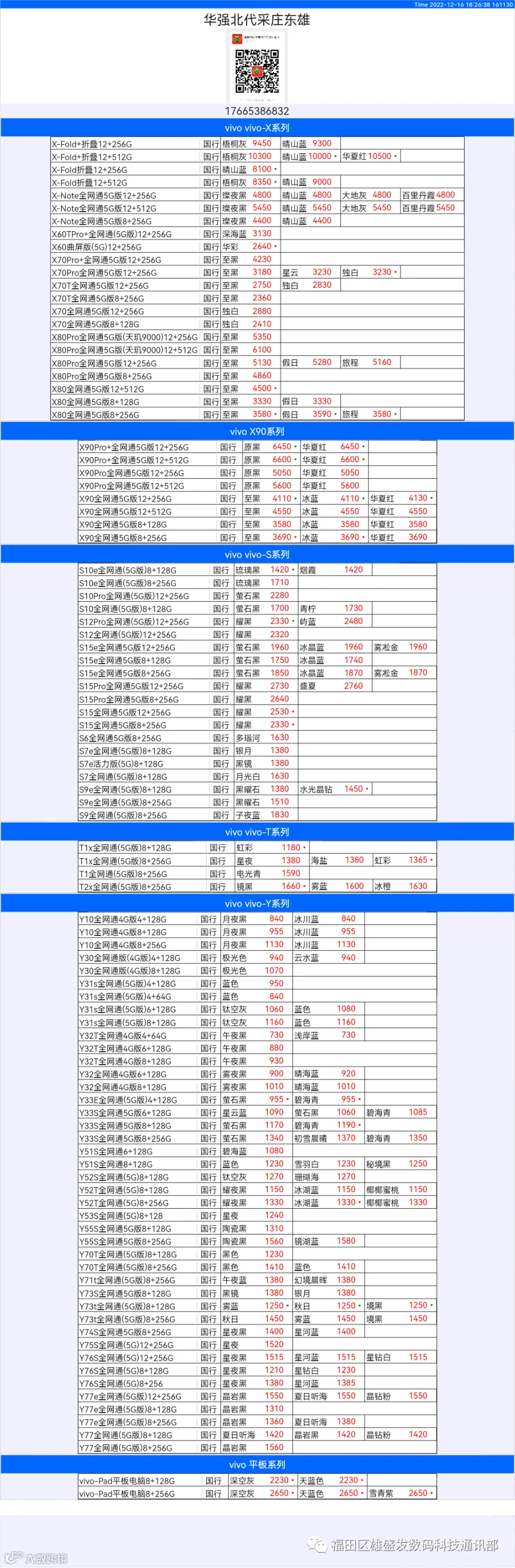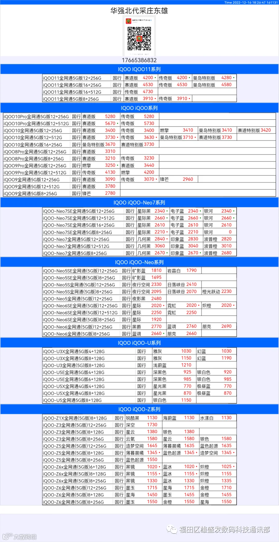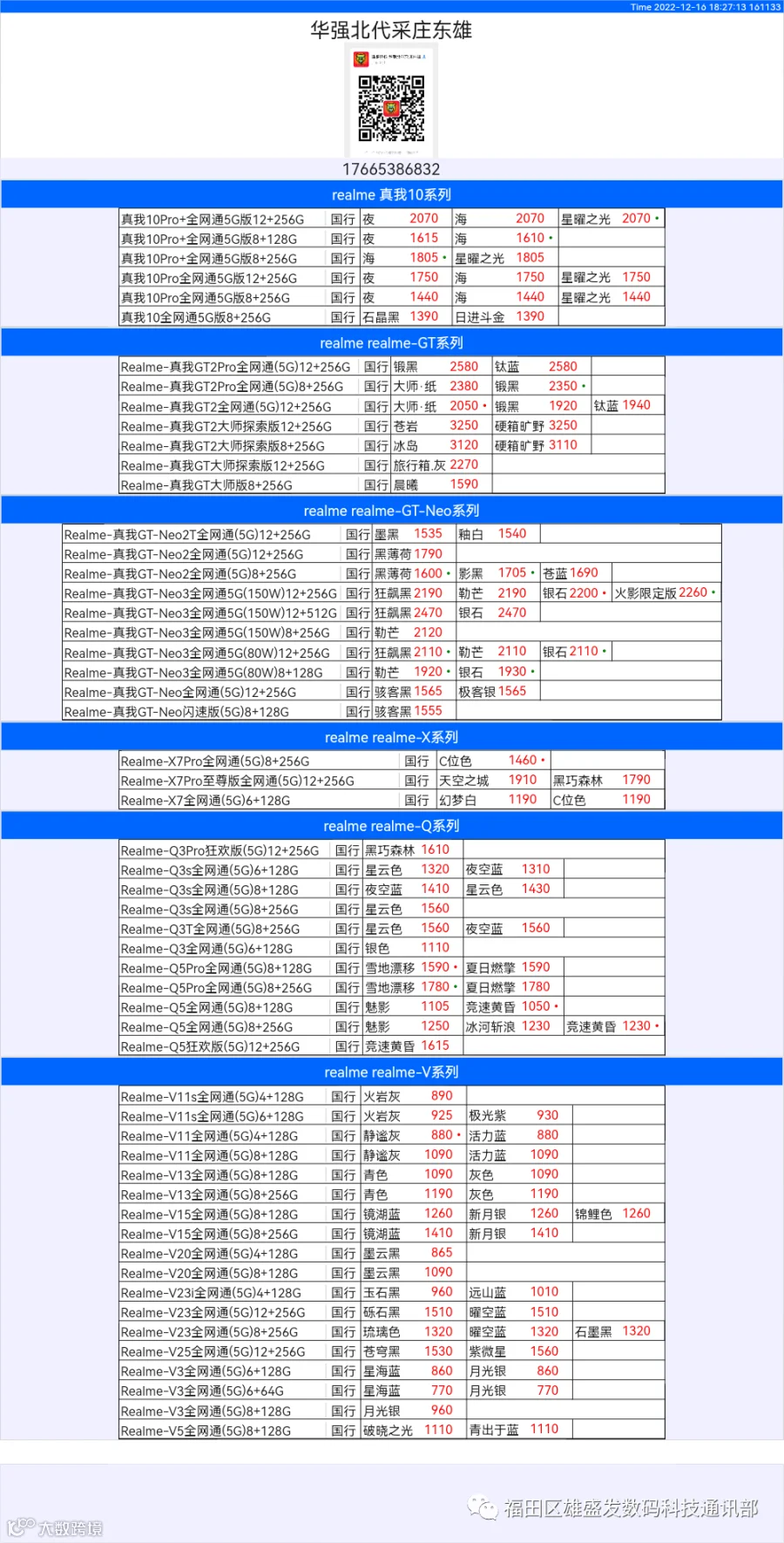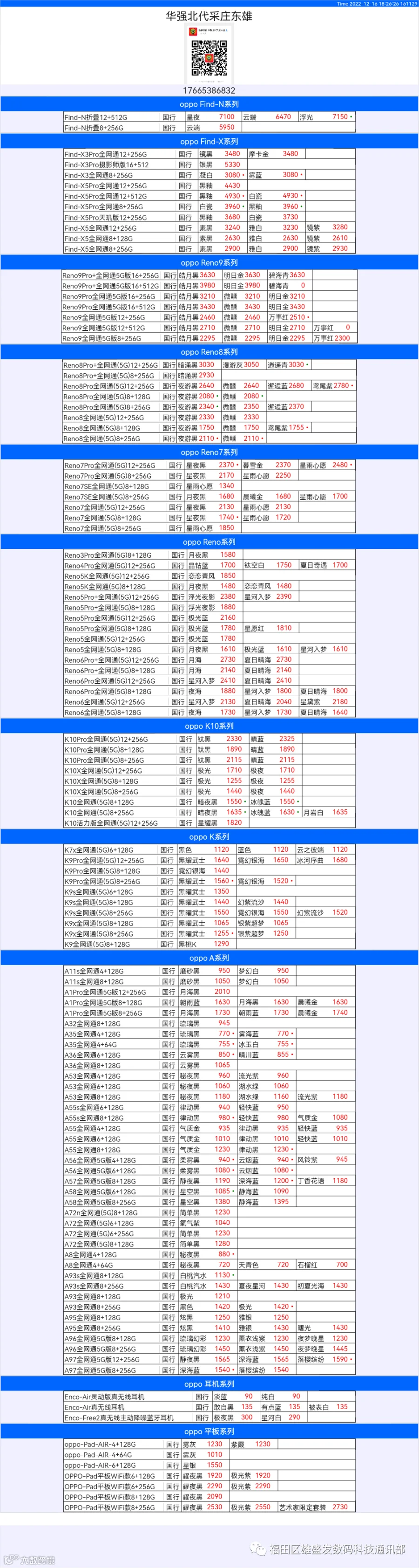 新机报价【2022年12月16日】OPPO   VIVO  IQOO   一加   真我 芯烨微 电子科技