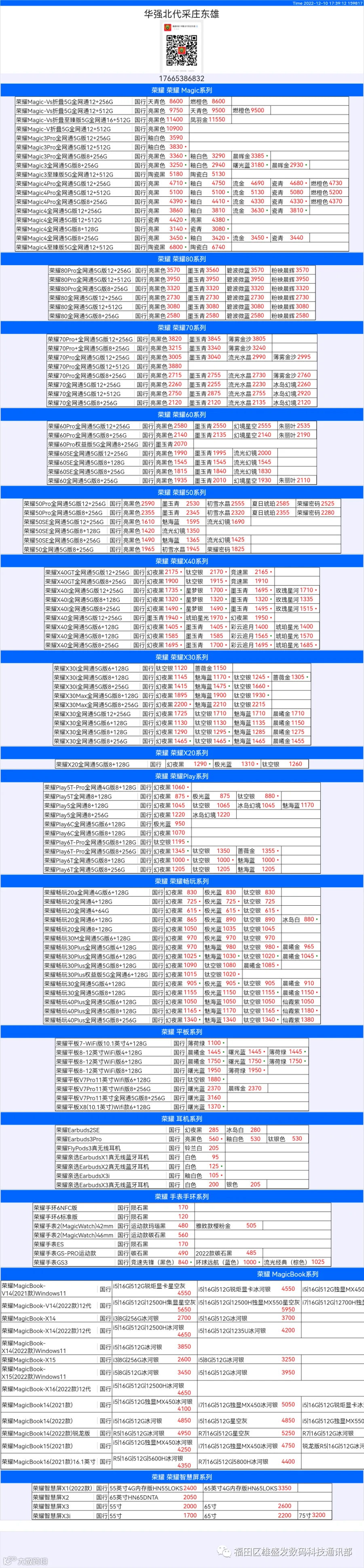 新机报价【2022年12月10日】华为   荣耀 报价 芯烨微 电子科技