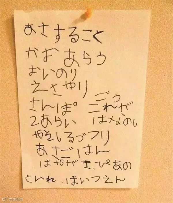 墙上的纸条,是阿花写给自己的工作表:洗脸,祷告,喂狗狗,散步,洗手,做酱汤,吃早饭,刷牙,钢琴,上厕所,上保育园。