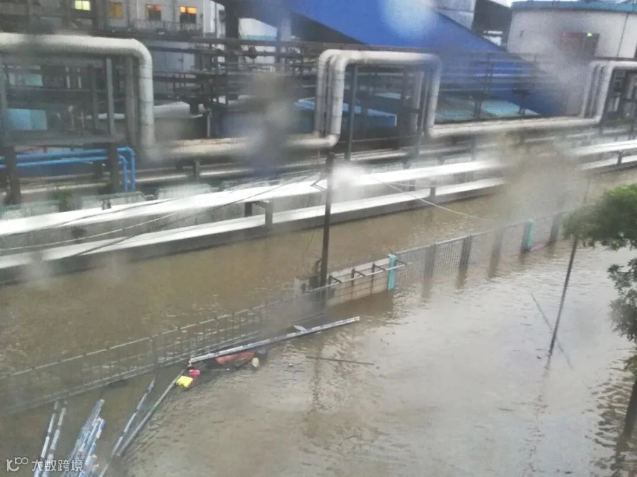 码头防洪墙尚未建成,洪水漫过界面,污水厂、饭堂、电房一片汪洋。消防泵房内,三台关键设备面临被淹风险。