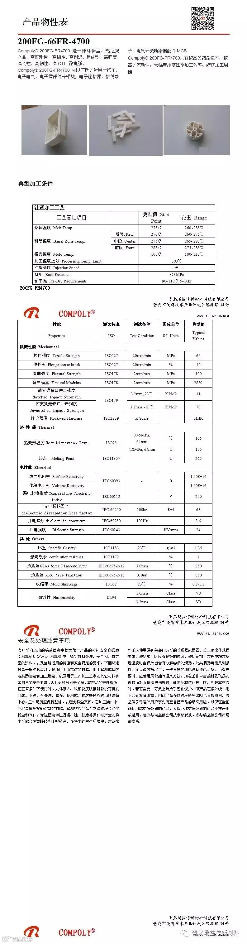 青岛瑞益信新材料Compoly® 200FG-FR4700 是一种环保型阻燃尼龙产品,高流动性、高韧性、高耐温、易成型、高强度、高韧性、高韧性、高CTI、耐电弧、