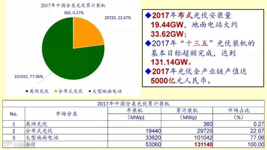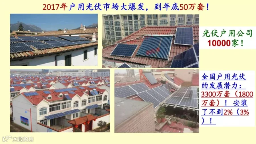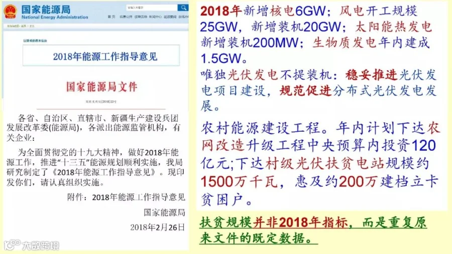 最后最新的这个文件是这样规定的,就是户用的村级电站跟户用的扶贫,村级电站是在2017年一次性下达指标,其实就是4点几个G,2020年村级电站全部就这么多了,就没有再增加了。异地扶贫,每年给你提供这个指标。去年大概有17个省转成了异地扶贫,把普通电站变成了异地扶贫电站,大概9个多G,加起来已经是有了十几个G,加上头两年大概已经解决了150万户,超过了20G,估计异地扶贫今年还会有,而且不限于200万,我是这样认为的。当然,国家能源局的能源工作指导意见里面有一句,15GW,200万户,这实际上不是一个指标,不是说今年要下这个,还是重复原来的文件,15GW,200万户。但是实际上按照现在来看,这不是具体的,具体的村级电站下达问了,2020年就是4个多G,异地扶贫是每年下达。分布式光伏发电不说了,光伏+的发展潜力也不说了。