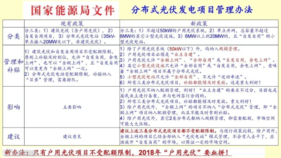 总的来讲,主要影响的是户用光伏均纳入规模管理这当然是没有问题。包括户用包括小型电站,包括小型的规模电站,小型的光伏设施,补贴都能够及时发放,这是一个利好,反是做分布式的,将来就不会有补贴拖欠的问题。所有的其他项目,除了户用都要配额,而且不允许全额上网,所有全额上网的项目通通不享受分布式的政策,就是你不能够拿到补贴,你要去排队。不像原来,原来是不用排队的。而且,除了户用之外,其他的自发自用的项目也都需要配额,这一下子把这个空间大大压缩。所有光伏专委会也跟国家提意见,能不能这三类自发自用的项目,包括户用,户用还是可以全额上网的,还是可以选择,也可以全额上网,也可以自发自用。这三类是不是都不受配额限制。这三类如果只有户用不受配额限制的话,那增加了很大的管理成本,而且交易成本就会非常高。那都掌握在政府手里就会出现问题。但从现在最新的政策如果公布的话,那么户用光伏就要血拼了,因为只有户用不受配额限制,只有户用可以全额上网也可以自发自用,任意任选。其他的就要等配额,现在配额也没下,到底放多少量不知道,所以这是最新的分布式的政策。