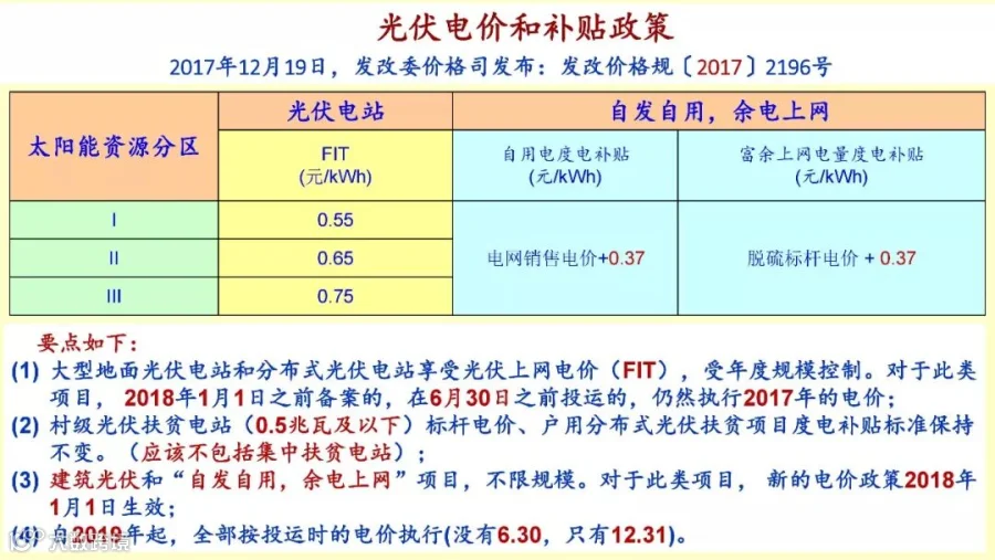 分布式的最新政策,今年是新能源电价,一个是电站降下来了,第二个扶贫和村级电站,村级扶贫的户用光伏,他的补贴标准是不变的。建筑光伏和自发自用的项目,2018年1月1号起这个新的电站政策就生效了。那么2017年起,全部就没有6.30了,只有12.31了,这是几个新的电价的特点。