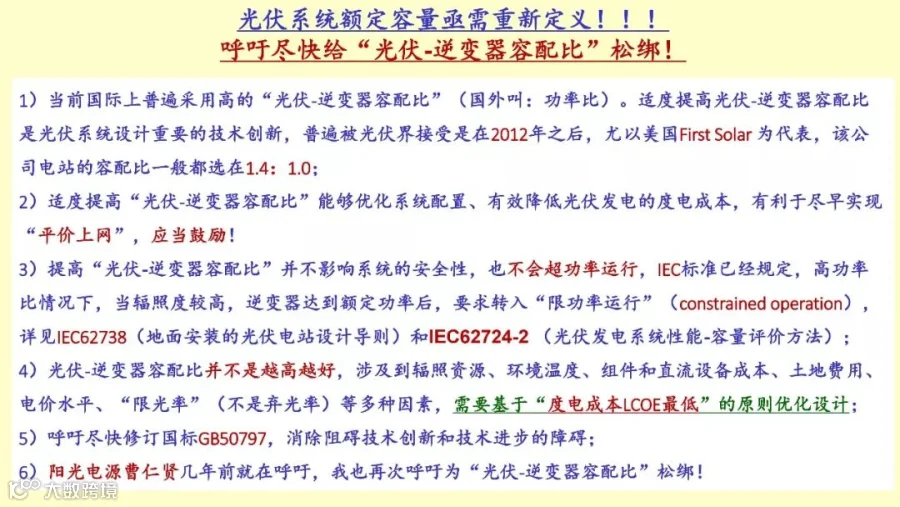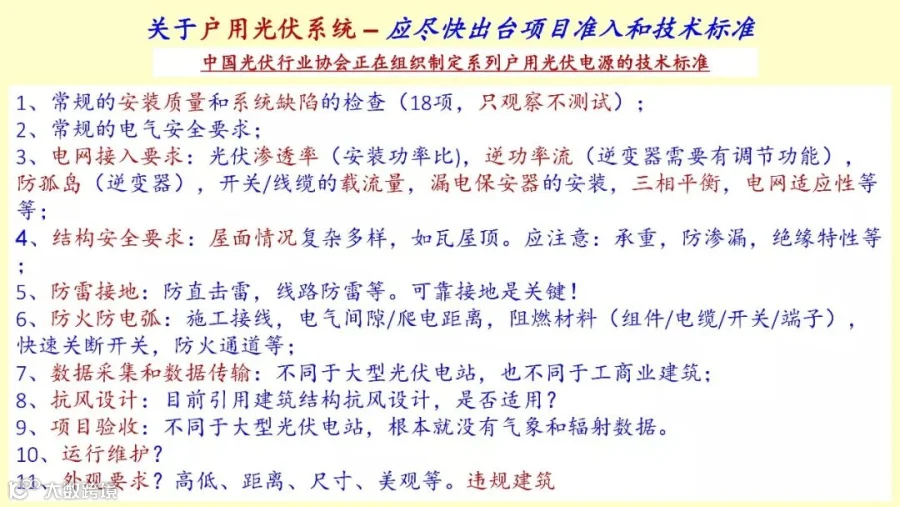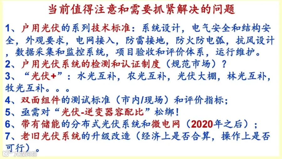 要抓紧解决的问题我就强调一下,第一户用光复的系列技术标准,包括系统设计,电气安全和结构安全,外观要求,点网接入,防雷接地,防火防电弧,这些还没有制定,去年50万户,今年六七十万户都有可能,全部是1800万户,甚至是3300万户,去年完成了1-3%,将来还有93%的市场空间,今年有可能冲到100万,都有可能。但是所有的标准都没有,质量问题就有可能出现问题,这是非常急需解决的。第二,户用光伏是不是可以建立认证制度,没有认证制度,那就是鱼龙混杂,谁便宜,谁坑老百姓谁就去上去坑,那就乱套了,所以认证制度需要建立。另外“光伏+”的技术标准现在也确实,双面组件的测试标准,你的PR值怎么考虑,实际发生功率怎么考虑,没有标准没有办法考虑采用双面组件的光伏电站,就没办法它的质量怎么算,所以急需制定双面组件的测试标准。急需对光伏逆变器容配比,实际上这是一个创新,只有中国现在限制,这是完全不合理的,全世界都在扩装。带有储能的分布式光伏系统和微电网,老旧光伏系统的升级改造,当然经济上是否合算,操作上是否可行还有待观察。