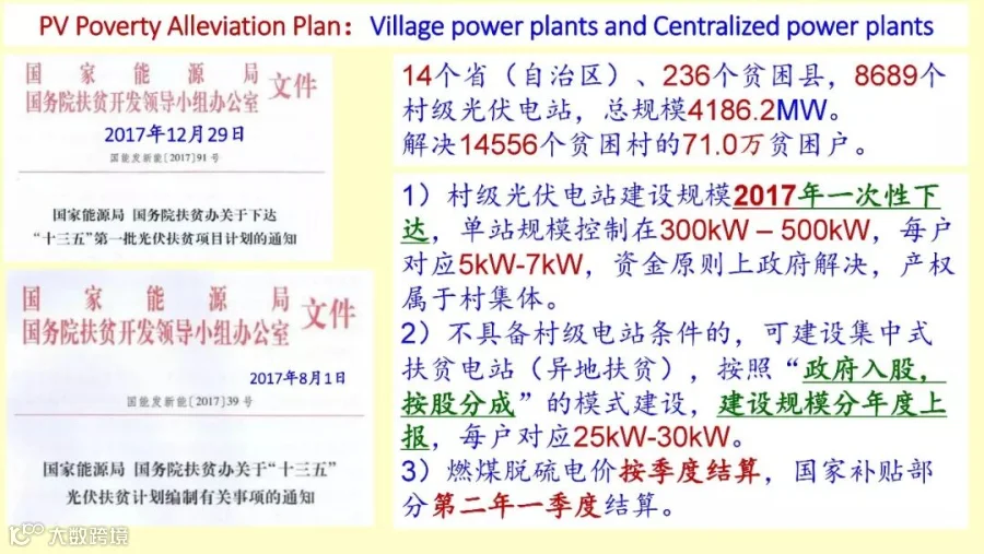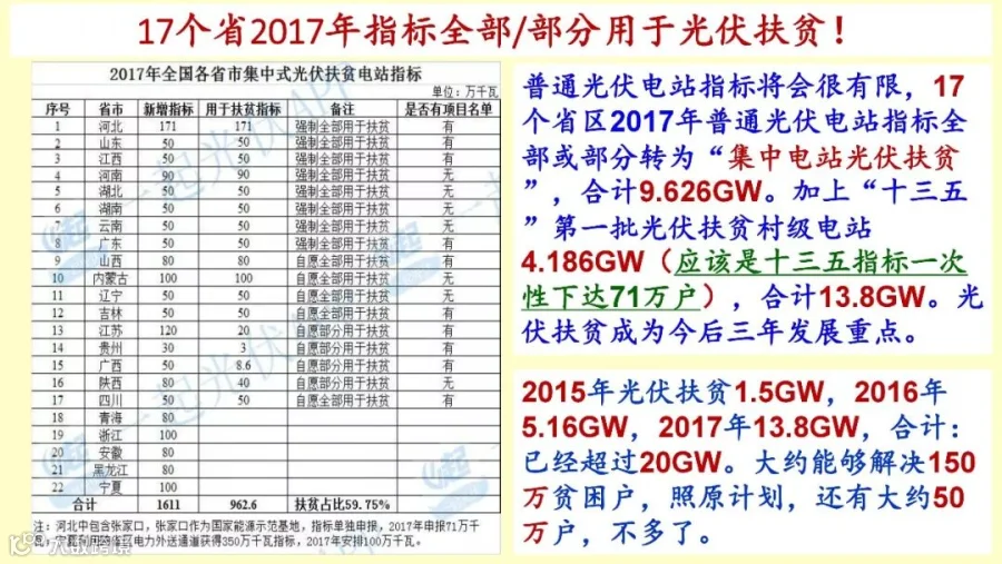 光伏扶贫项目现在有2000万户,7000多万的贫困户,收益在每天一美元以下,这是我们国家的标准,国际标准是1.25美元每天。这么多的贫困户,光伏要解决200万,大概15GW,这是这个文件里面规定的,我们通过光伏要解决200万户。