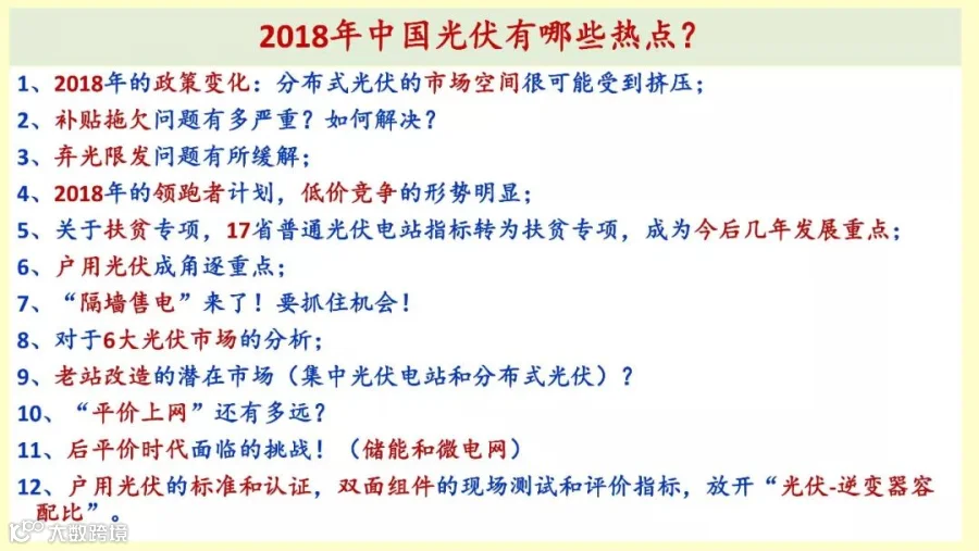 王斯成:大家早上好,今天主要跟大家讨论几个热点问题,2018年有哪些热点?第一政策变化。分布式征求意见稿征求了一轮了,现在没有正式公布,但是总的原则就是分布式的空间很有可能受到挤压,要控制分布式的规模,这是国家能源局的文件。第二,补贴拖欠,这个大家都知道。第三,弃光限发问题。补贴拖欠的问题到现在仍然没有解决方案,也是大家都持续关注这个问题。第四“领跑者”计划,低价竞争的形势明显,三类区3.9毛已经出来了,很有可能格尔木的投票就能投出3.5毛,关于扶贫是今后几年的发展重点,17个省的普通电站已经全部转为或者是部分转为扶贫项目,因为扶贫项目是补贴拖欠没有这个问题。户用光伏成为重点,那么户用光伏爆发式的存在也存在一些问题。第七,隔墙售电,这个给光伏开通了一扇窗,这是一个机会,谁抓住了这个机会谁就能够走出这个机会。第六大光伏是什么呢,老站改造,这已经开始有人琢磨这个事了。过去享受高电价,老站改造的潜力大,很多人也考虑到这个问题了,很明显的提高收益。“平价上网”,原来大家说2025年,现在说2020年,我刚刚说了一类区就有可能做到平价,后平价时代对我们有什么挑战?再有就是光复的急需解决的问题,户用滚复的标准和认证,双面组件的现场测试和评价指标,还有光伏逆变器容配比是不是能够放开。现在各个省都在限制,包括“领跑者”计划,也在限制不需要扩装,显然是不合理的。这个就是我认为2018年的热点问题。