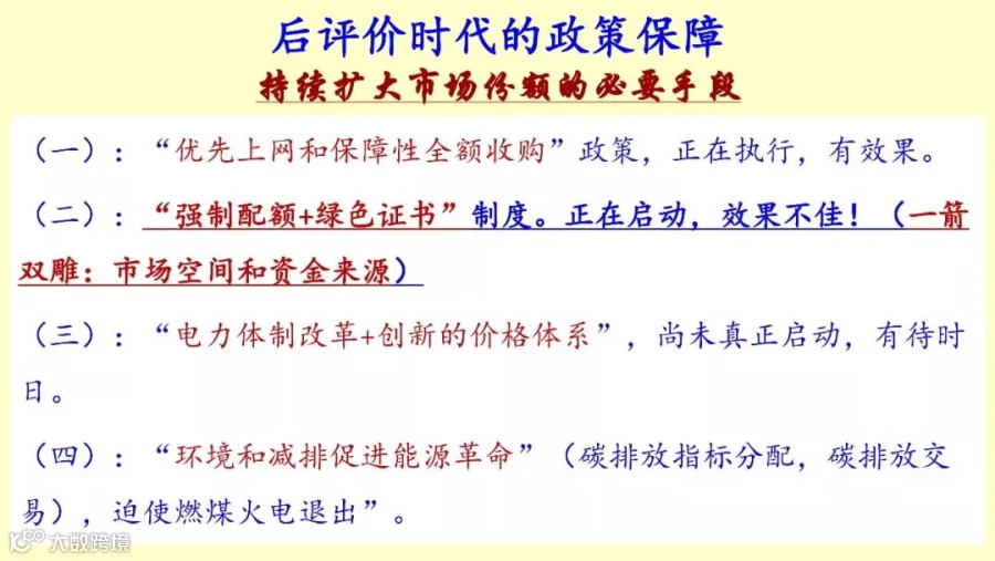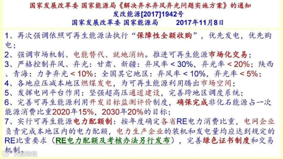 弃风弃光会越来越好,这个文件非常重要,本来这里面需要讲的我们最关注的实际上是电力配额和绿色证书,是这一条,电力配额,强制配额和绿色证书不但可以开拓一个很大的市场空间给光伏,而且也解决了资金来源的问题。可是加了一句话,(RE电力配额及考核办法另行发布),等于是和其他的部门没有协调下来,就不落地,不落地市场空间的问题任人拿捏,没有一个强制配额。另外补贴资金仍然没有着落,就变成这样的局面。关于配额制和绿色证书这个制度,强制配额并没有落地,所以补贴资金的问题仍然没有解决,市场空间的问题仍然是一个悬念。所以这两个非常重要。