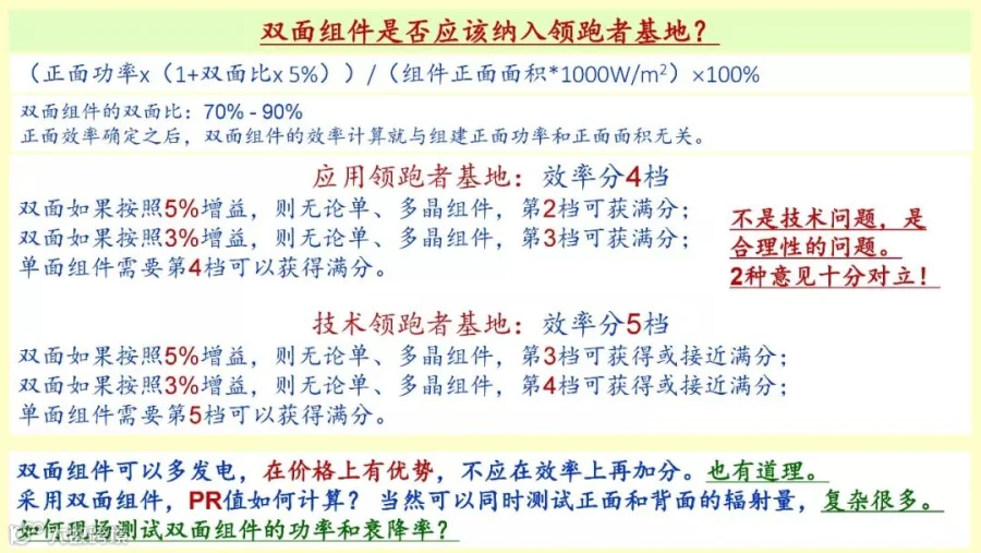双面组件电池 ,对于技术“领跑者”是不是双面电池要加分,我们光伏专委会从技术的角度上认为应该加分,我们就建议了加分,结果一下反弹,好多人给我发短信,打电话指责我,说双面电池本来就占便宜了,功率高,没有再给效益加分,不应该算功率增益,所以形成了截然不同的意见。当然最后现在也不知道,双面是不加分的,但是技术“领跑者”基地将来要不要加分,还不知道。至少争论得非常厉害。