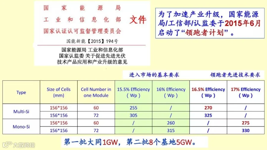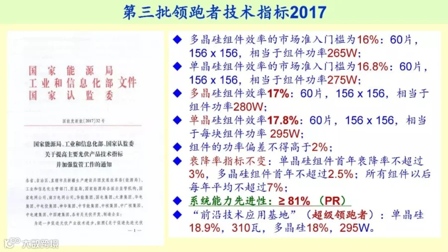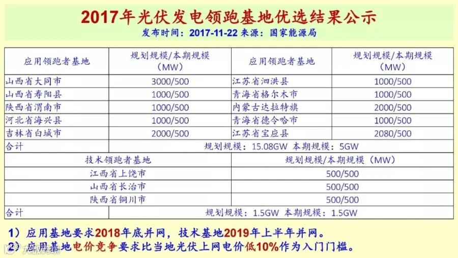 那么“领跑者”,这个是新的指标,大家都知道。正在陆陆续续地在招标,现在5GW正在陆续招标,技术领跑基地现在还没有开始。当然,“领跑者”基地是边界条件非常清晰,所以大家都还在争,因为它的土地、接网、融资等等都是有保证的,比较规范,所以比普通电站好得多。光伏专委会已经给大家提了,给能源局了发了一些意见,第一对于超跑基地要求并网量太高,完成超出了高效、先进这个电池产品的门槛。单个项目规模不少于250兆,这个很胡闹,所以非常有争议的。希望在招标评标的希望作出相应的调整。