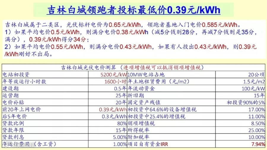 当然最低价0.39已经投出来了,我也做过预算,要什么样的边界条件,生意到底怎么样,我大概算了一下,按初一个千瓦5200,运行小时数1600,当时做过这个项目,他说固定安装可以在1600,按照3.9,其他的边界条件写在这儿了,算下来真的还是可以,就是3.9在二类区还能有收益率达到7.9,将近8,这还是很可以的,还没有加其他的,这个已经可以做到8%左右的,还是可以的。所以很有可能就降到能投出3.5的电价。