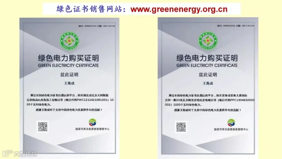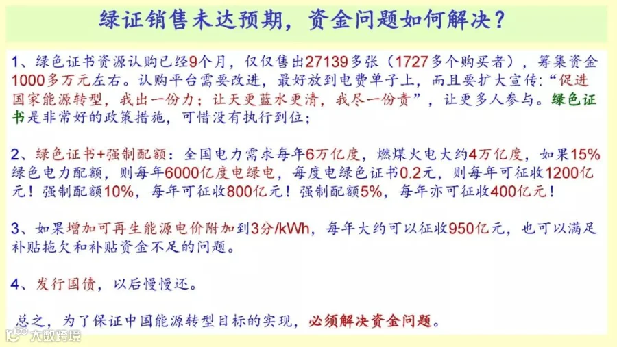到去年年底已经拖了1100亿,但是这个问题到现在仍然没有解决,所以这是我们一直在呼吁的问题。所以想通过绿证,去年我花了110,去年因为有一个峰巅,今年我花了1400,我自己用的电至少都是绿色电力,我想问一下,在座的哪些人买了绿证?比过去还是有进步,但是太不行了,每年征集的资金可能要上百亿,现在看来不行啊,但是现在至少有几人都知道,我希望大家作为一个有责任的人,到这个网站购买这个绿站,每年自己用的电要保证,用的是绿色的、清洁的电力。