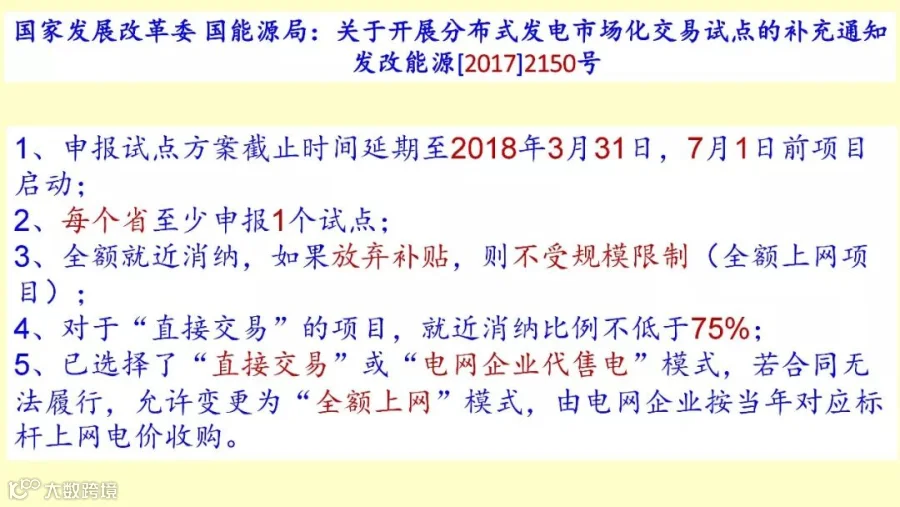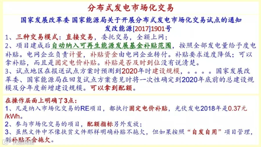市场化交易,这就是电站。首先你如果申请了电站,尤其那些没有拿到标的项目,直接进入到电站的话,直接给你指标,直接给你配额。第二个是固定电价补贴,先拿到3.7毛,然后跟用户谈,那么你的收益有可能非常高。第三,补贴绝对不会拖欠,这个是几大好处。但是现在的试点,每个省至少报一个试点项目,到3月底申报项目的截至期是3月底,谁能拿到这个电站项目,有可能上升到110千伏,都是大的,几十个兆瓦以上的,甚至上到50MW的,配额单独给你,这是一个机会。