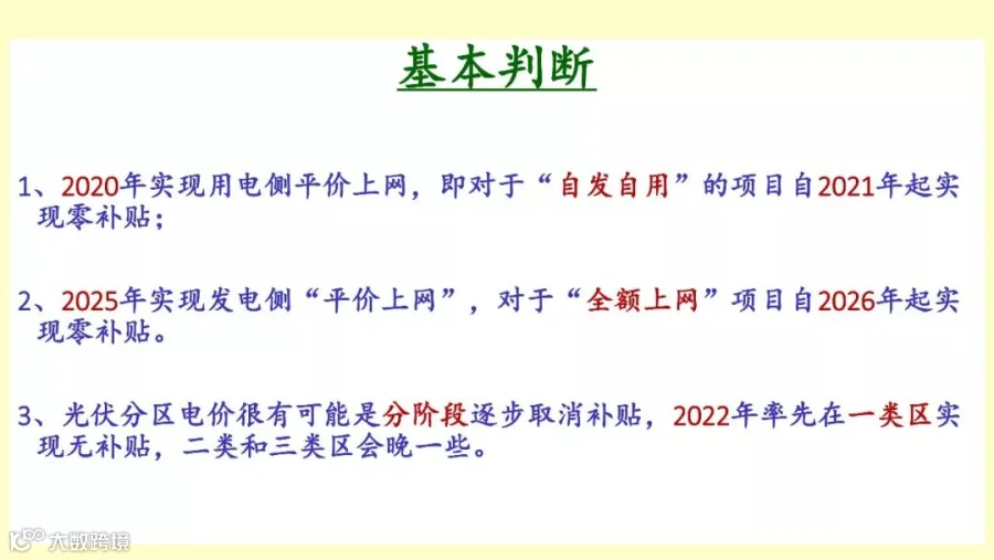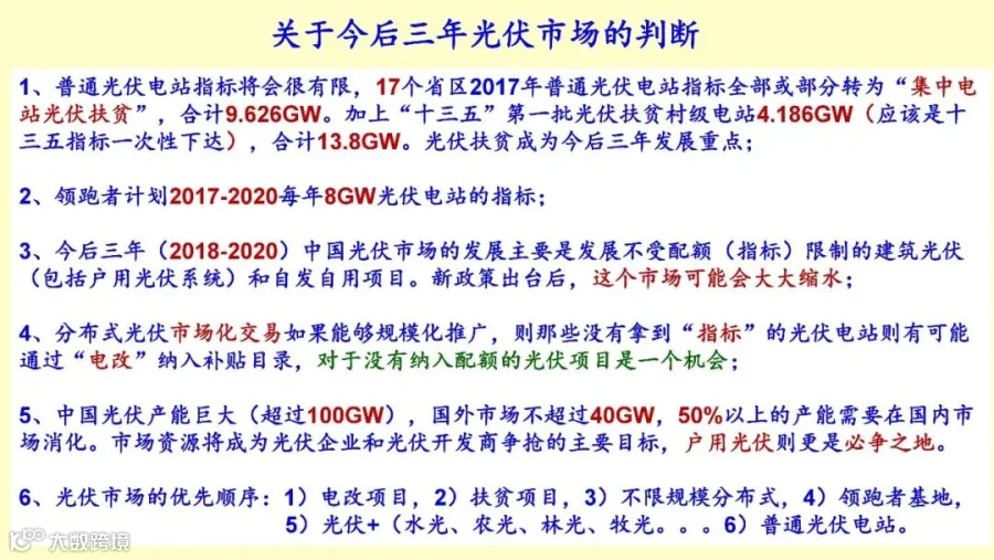 还有对今后三年的光伏市场的判断。第一普通光伏电站的指标将会很有限,去年的指标几乎全部都是有于光伏扶贫了,异地扶贫的集中电站。今年会不会仍然有一些省把集中电站的项目拿过去做补贴,因为扶贫电站的项目明确是不会补贴拖欠的,所以扶贫的将来是一个重点。第二个“领跑者”计划,8GW的指标。今后三年部首配额限制的,当然分布式的那个还没有公布,如果不公布那么仍然是建筑光伏户用电源自自发自用都是不受限制的,但是如果受到政策限制,那么只剩下户用不受到配额限制,户用可能是一个指标。另外市场化交易可能是一个机会,以后放开的话,大家都有机会拿到。因为它是不会有补贴拖欠,而且收益非常高,而且单独给配额。