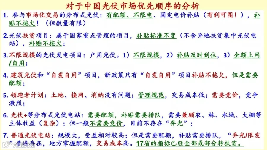 中国光伏的巨大产能,这几个市场的先后顺序,第一我认为是电站项目,市场化交易的项目,是最有保障的,而且有利可图,补贴没有拖欠。第二个是光伏扶贫项目,当然补贴标准不变,500千瓦以下的项目,异地扶贫的电站点价仍然是2018年的电价,就是补贴,但是是不拖欠的,所以第二优先的是扶贫项目。第三是不限规模的项目,原来是建筑光伏和自发自用,通通不限规模,现在有可能只剩下户用光伏。建筑光伏“自发自用”项目有可能是需要配额的,“领跑者”计划这没有问题,仍然是竞争的焦点,因为它的边界条件,土地、融资等都没有问题,边界条件非常规范,所以比普通电站要好。光伏+第一需要配额,第二它的补贴需要排队。唯一的好处有可能它不需要竞价,目前不存在“弃光”,但是需要兼顾农、林、水浴、大棚等的主体收益。比较复杂。第七个普通光伏电站没有指标了,即使有,第一需要配额,第二补贴需要排队,至少拖三年,所以交易成本高,所以土地也不知道。所以说,七大市场我是这样排序的。