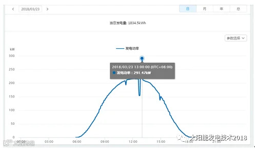 该电站实际装机容量350kW,3月23日峰值功率291.47kW,当天发电量1834.5kW。
