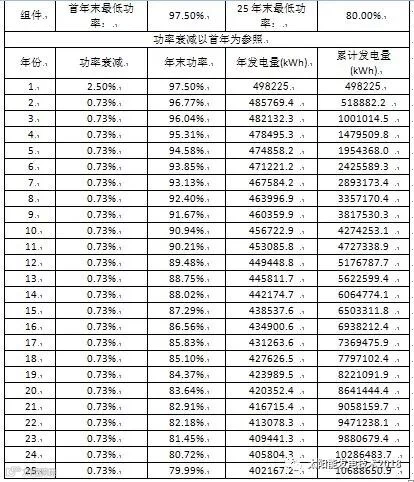 装机容量325kW,PR=80%,山东地区的光照按照全年每天4.2小时计算,(参照——全国各省峰值日照时数),全年发电估计时间为1533小时,预估该项目首年发电量498225度。首年衰减为2.5%,25年末最低功率为80%。首年衰减为2.5%,25年末最低功率为80%。