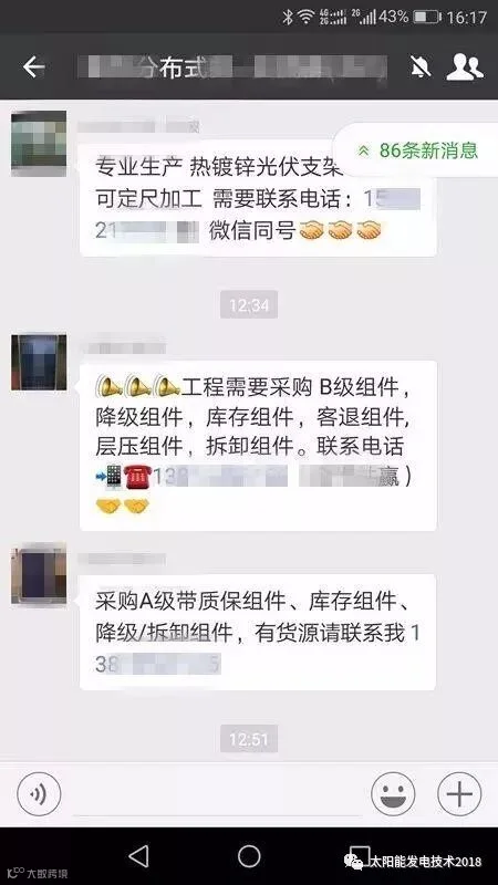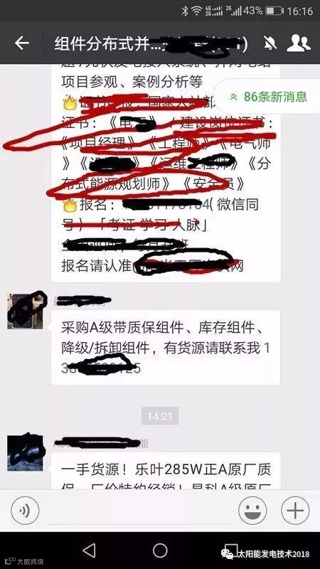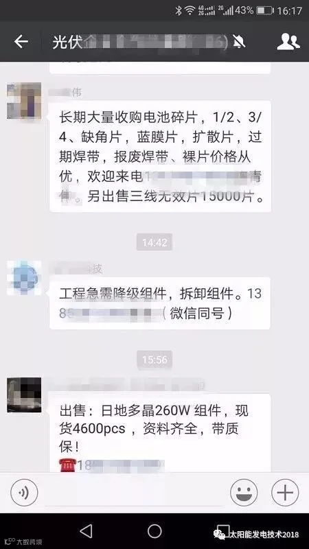 按照平时掌握的情况来看,主要的来源是两个大的方面。一是部分厂家联营生产或是代理公司贴牌生产。有的生产厂家为了缓解财务紧张,和一些小厂联营,把不合格的小厂手工生产的组件贴上大厂的标识,共同谋利。另有一些小组件厂家为打开销路,违法贴牌生产名牌产品,导致产品质量达不到正规厂家的A级标准。还有一些代理为谋取利益,请小厂生产便宜的组件,贴上品牌出售。业主不了解这些产品底细,便在代理的忽悠下安装了这样的板子,此类板子刚安装1-5年内一般不会出现问题,但随着时间的增长,5年以上会出现衰减不合格不达标,发电量直线下降,为业主造成损失。二是在市场上收购的不合格组件产品再加工出售。一些为了利益在社会上收购一些损坏、拆卸、降级、低效组件,贴牌或换牌后再出售,谋取不义之财。以下是微信群里收购和出售组件的,这样的消息太多太多了哈!!