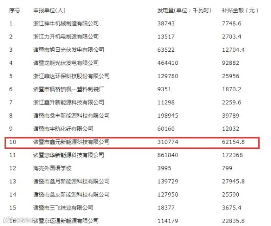 其中,诸暨市鑫元新能源科技有限公司5MWP分布式光伏获得补偿 5845904 元。(约1.16元/瓦补偿)记者查阅资料显示,诸暨市鑫元新能源科技有限公司成立于2016年,从事太阳能光伏发电技术的研究、开发、咨询服务;太阳能光伏发电项目的建设、投资、管理;太阳能照明设备的研究、开发、制造、销售、安装、维修。