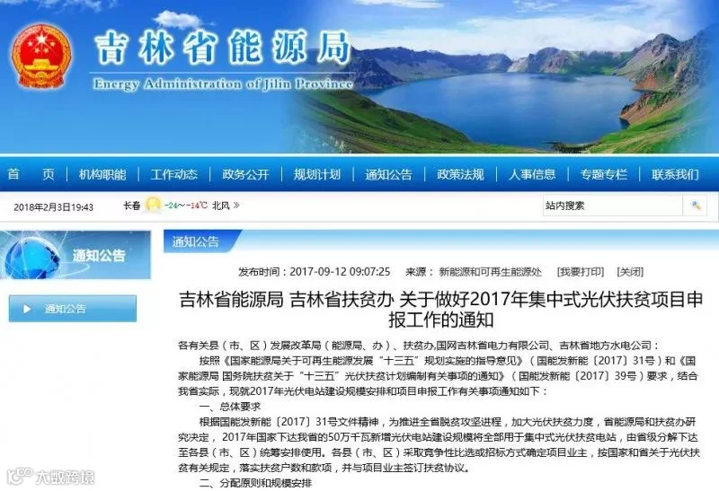 吉林省能源局、吉林省扶贫办下达《2017年光伏扶贫项目计划通知》。