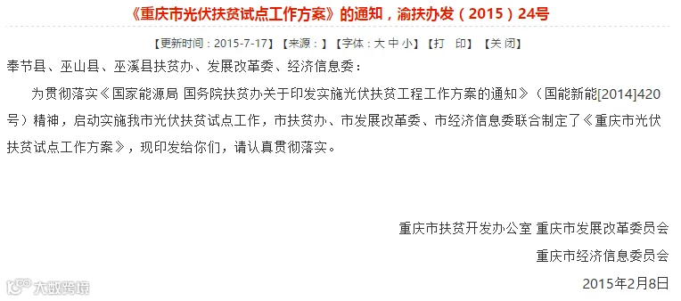巫山、巫溪、奉节三个县试点建成的户用光伏,按照渝扶办发〔2015〕24号文件执行。