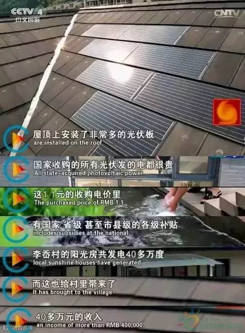 晚上,央视《走遍中国》 5集系列片《点亮生活》(3)我家阳光能挣钱,介绍了浙江省宁波县李奥村光伏发电致富。