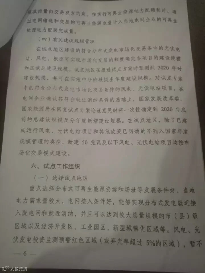 国家发改委和国家能源局将在回复试点方案论证意见时一次性确定试点地区到2020年底前的总建设规模及分年度新增建设规模。试点地区的新建50MW以下风电、光伏电站项目均按市场化交易模式建设。