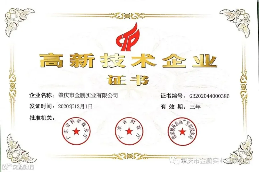 在这一年里,我们金鹏公司不仅再次通过了国家高新技术企业的认定,并且获得了“科技型中小企业”的称号;更是在我们金鹏研发团队的努力下,获得了两项实用新型专利授权证书。这表示我们金鹏在获得国家认可的同时,也大大提高了企业的核心竞争力。