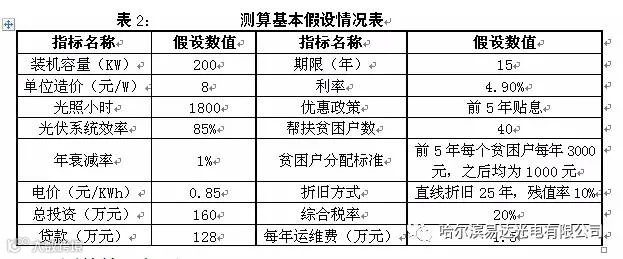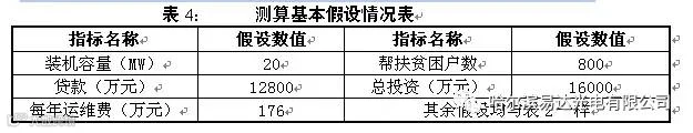 相对于前者,集中式光伏电站日常运维费用更高,每个建档立卡贫困户对应不低于25KW的发电规模。对于III类资源地区、1800光照小时数的20MW大型电站,按如下假设测算(具体测算数据略):