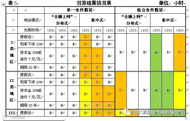 单一条件假设及组合条件假设(即贷款利率下浮10%、资本金比例30%、造价变为7元/瓦,贷款期限20年能够同时满足时的情况)的测算结果见下表: