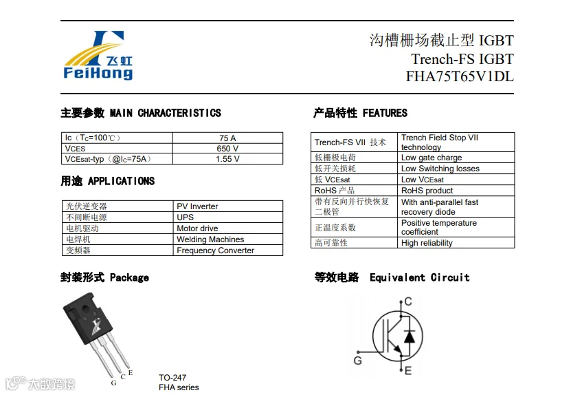 FHA75T65V1DL是一款性能全面、封装适用广的IGBT单管,特别适用于太阳能逆变器、UPS、变频器、电焊机以及所有硬开关等电路设计。飞虹半导体作为国内功率器件重要供应商,不仅提供各类型IGBT单管、IGBT单管、三极管等标准型号,还支持定制化需求,并已实现与多家厂商的稳定合作。