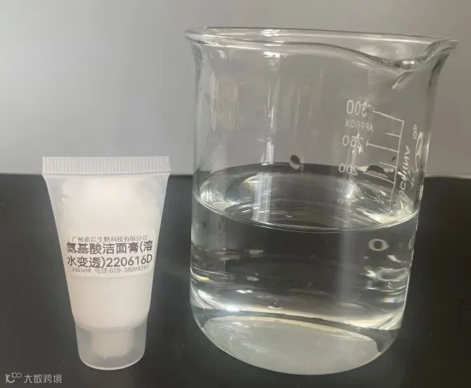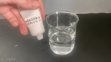 将适量料体挤进清水中,搅拌溶解之后,杯中清水依旧呈现清澈透明外观。