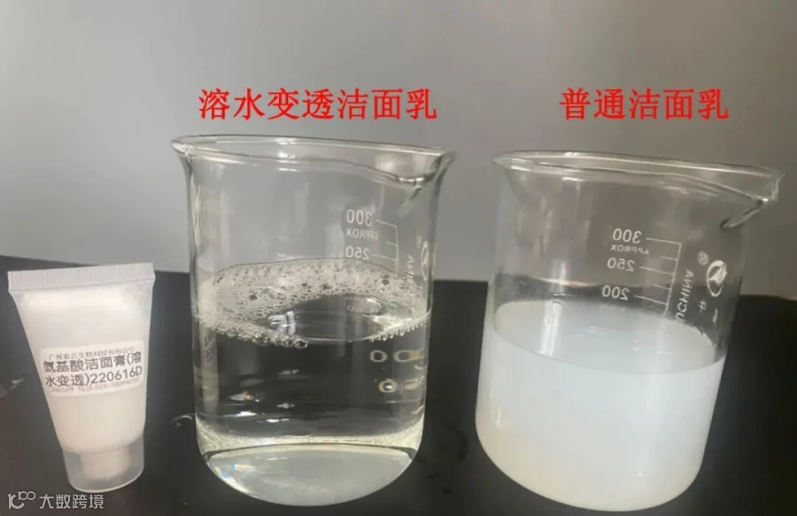 普通洁面乳加入清水中溶解之后,清水变的乳白浑浊。