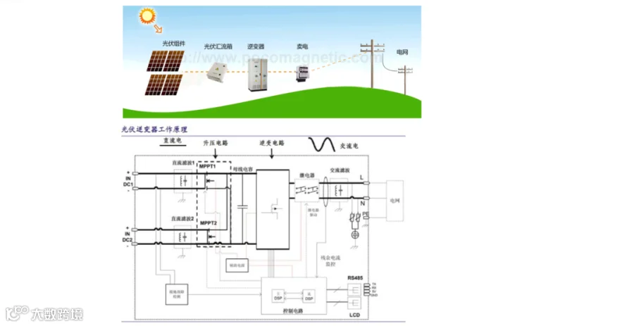 1、集中型逆变器,适用于大型光伏发电站,通过连接若干个并行的光伏组串到同一台集中逆变器的直流输入端,一般功率大的使用三相的IGBT模块,功率较小的采用MOS/IGBT单管,同时通过DSP转换控制器来改善电能的质量,使它接近于正弦波电流,主要用在大于10KW的集中式光伏发电站。集中式光伏功率通常在MW级别,主要在荒漠、山区等偏远地区集中建立大型光伏电站。