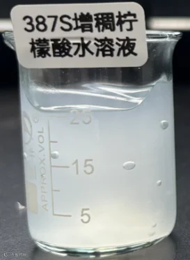 分别用SC-387S,羟丙基甲基纤维素,在相同增稠成本的前提下增稠pH为2.6的柠檬酸水溶液。