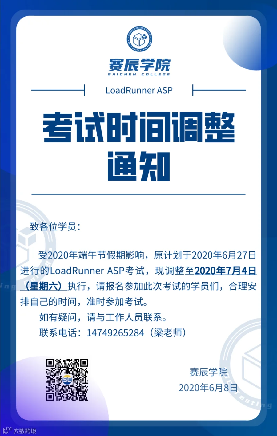 关于LoadRunner ASP 2020年6月考试时间调整的通知