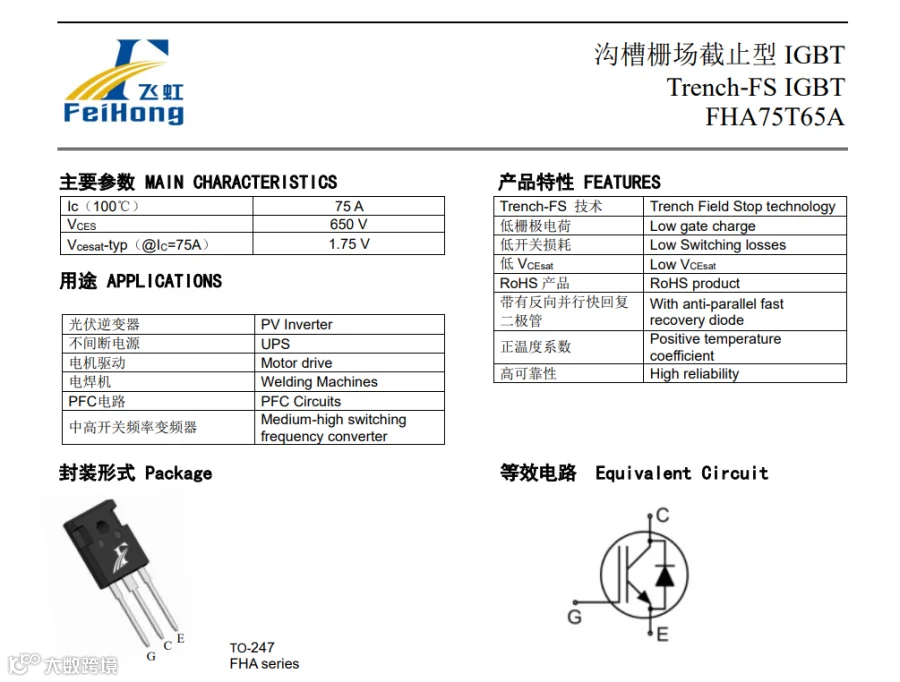 2、FHA75T65A的封装形式是TO-247,其具有75A, 650V, VCEsat典型值:1.75V,<2.0V;IC (Tc=100℃):75A;Bvces:650V;IF (Tc=25℃):150A;IF (Tc=100℃):75A。