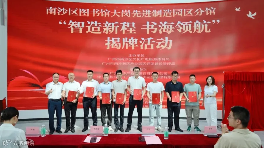 活动感谢状授予环节,南沙图书馆和产业园管理局相关领导为我司等积极参与图书馆建设的单位逐一授予感谢状,感谢各方在分馆建设与活动筹备过程中的积极配合与大力支持,各单位代表上台领奖,现场掌声不断。随后,在全场嘉宾的共同见证下,“南沙区图书馆大岗先进制造园区分馆”正式揭牌。