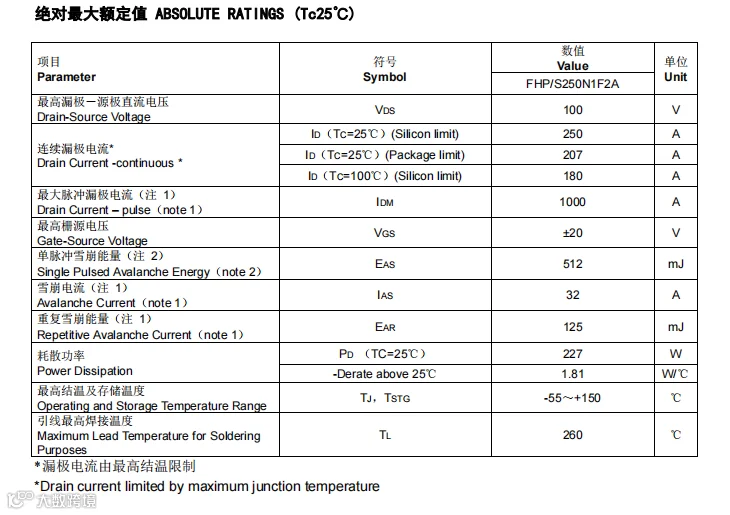 当然,在应用中,我们逆变器研发工程师一定要了解这款优质FHP250N1F2A国产场效应管的详细参数:其具有250A、100V的电流、电压, RDS(on) = 3.0mΩ(MAX) @VGS = 10 V,RDS(on) = 2.5mΩ(TYP) @VGS = 10 V,最高栅源电压@VGS =±20 V。