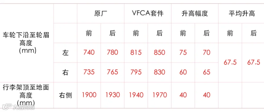 升级后,由于升高幅度较大,还需要换装前上摇臂,还原出接近原厂的主销后倾角。经一个月的行驶和微调,前后轮眉离地高度(微调后达到左右一致)平均升高了约67.5mm,车身前后整体等幅度抬升,LC150看起来更加威猛挺拔。