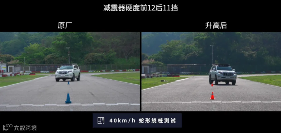 在通过同样的18米绕桩测试中,JAOS-KYB的VFCA减震器以40km/h的车速进行绕桩,悬挂反应节奏快,甚至比原厂更快,证明即便升高,VFCA减震器依然提高了车辆的公路操控性。