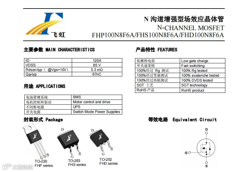 120A 、85V的MOS管替换使用,选对的型号参数让企业产品力up。飞虹已获得实用专利及发明15项,并与中山大学、中科院合作研发GaN器件。飞虹产品已经在太阳能控制器、各类DC/DC电源、储能电源、DC-AC逆变器、AC-DC开关电源、园林工具和BLDC电机驱动中获得广泛应用,帮助合作伙伴解决符合国情、符合国际质量的国内优质产品。除提供免费试样外,更可根据客户需求进行量身定制MOS管产品。直接百度输入“飞虹半导体”即可找到我们,免费试样热线:400-831-6077。