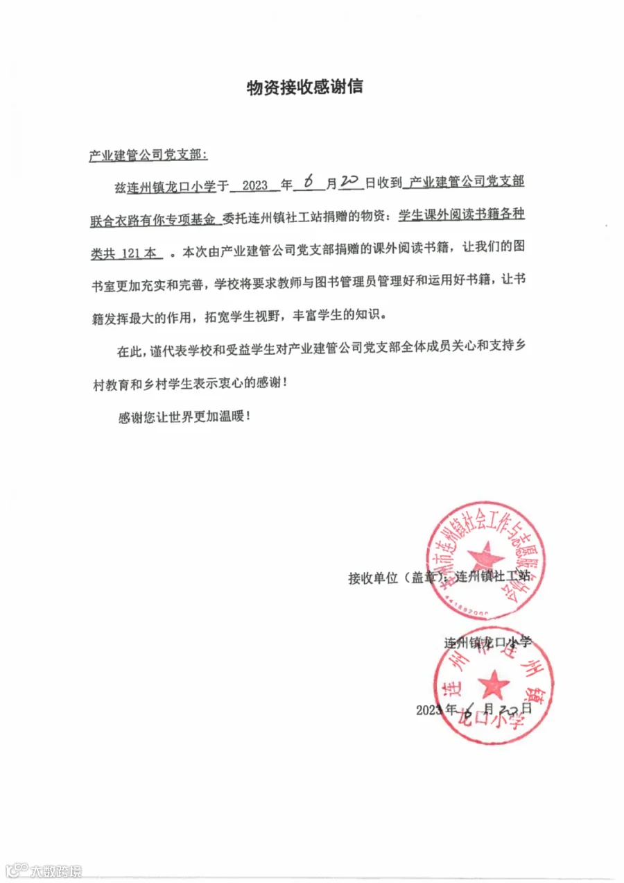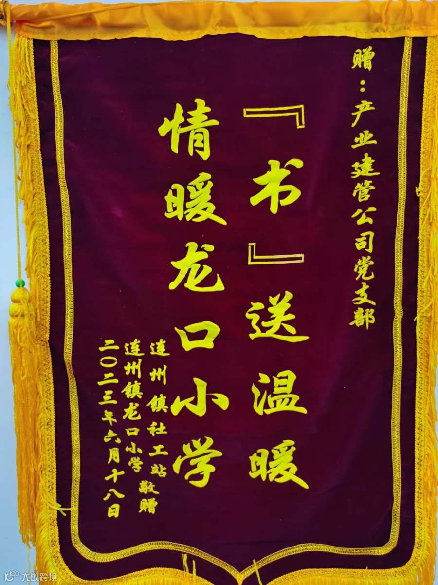 2023年6月29日,产业建管公司党支部收到来自广东省清远市连州镇社工站和连州镇龙口小学联合送来的锦旗与感谢信,特地感谢公司党支部党员和群众的爱心捐赠。