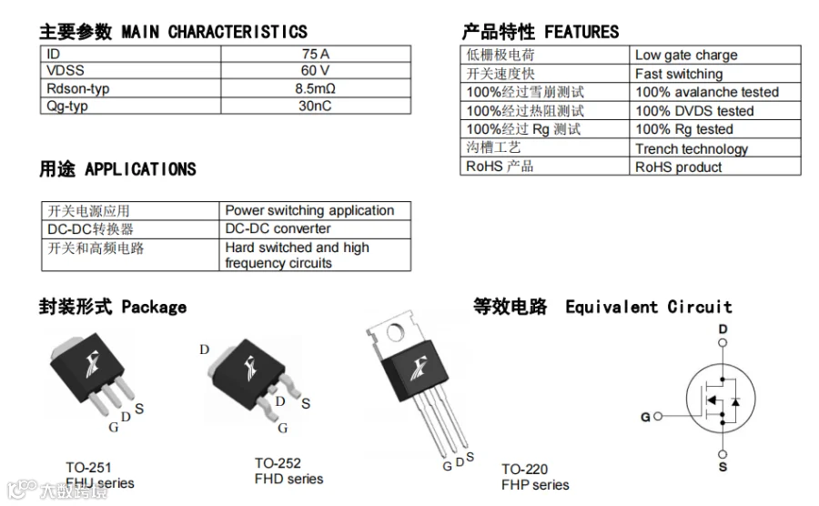 除上述符合的特点外,这款优质FHP50N06国产场效应管还具备的产品参数有:75A、60V的电流、电压,RDS(on) = 8.5mΩ(typ) @VGS = 10 V,最高栅源电压@VGS =±20 V。